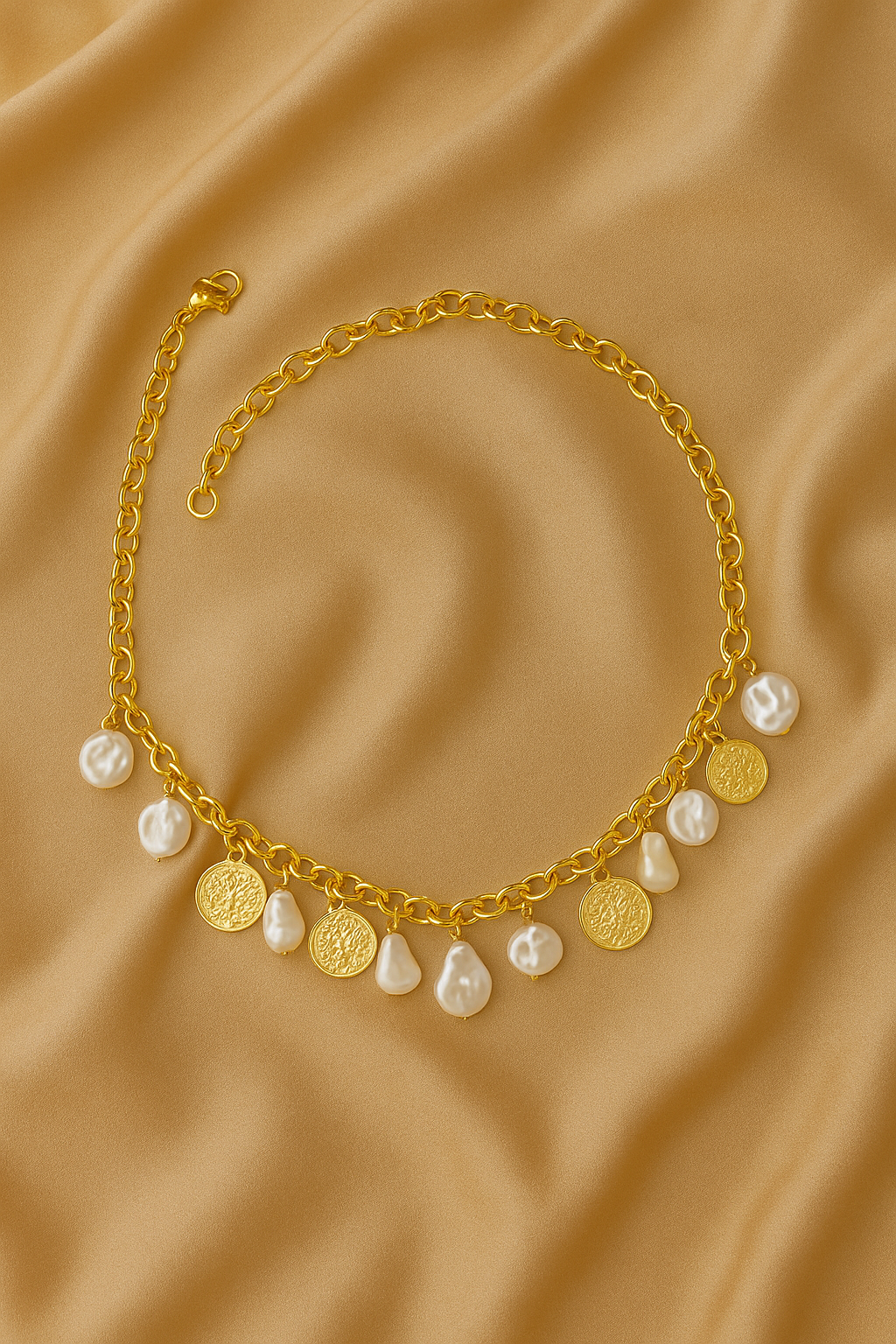 Delicate yet full of character, the Pearl and Coins Charm Neckhugger features a graceful chain adorned with tiny golden coin drops and slightly larger pearl-like charm each one adding a soft shimmer with every movement and offering a perfect balance of elegance and boldness. Whether layered or worn solo, this piece